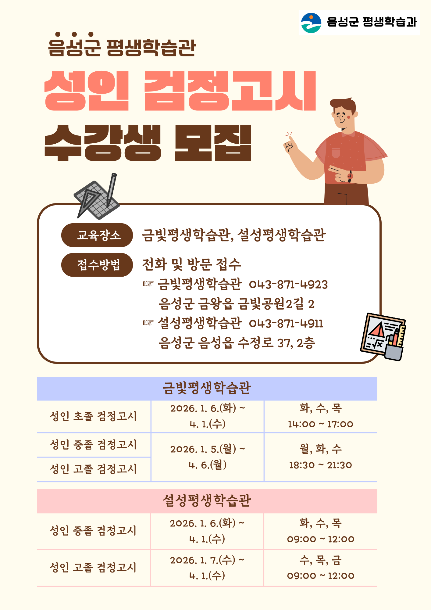 홈 알림마당 알림마당 평생학습도시 수강신청 평생학습 네트워크 평생학습관 평생학습 빅데이터 알림마당 홈페이지 가이드 통합검색 대시보드_tv 공지사항 공지사항 공지사항 평생학습 소식 자료실 보도자료 공유하기 페이스북 블로그 트위터 주소복사 닫기 인쇄 공지사항 알림마당> 공지사항 상세보기 - 공개여부, 제목, 작성자, 내용, 첨부파일 정보 제공 음성군 평생학습관 검정고시 학습자 모집 안내 작성자 : 음성군 설성평생학습관 4월 시험 대비 초졸 중졸 고졸 검정고시 학습자를 모집합니다. 1. 신청기간: 상시모집 2. 수강비용: 무료(교재비 자부담) 3. 접수방법: 방문 또는 전화 접수 4. 문의처 - 금빛평생학습관: 043-871-4923 - 설성평생학습관: 043-871-4911 5. 교육기간 및 수업시간: 붙임 참고 첨부파일 png 문서 검정고시 수강생 모집_수정.png 미리보기 수정 삭제 목록 게시물삭제 광고 반복작성 욕설 본인삭제 게시물삭제 이전글 2026년 상반기 음성군 평생학습관 정기강좌 강사 모집 공고 다음글 [채용] 2026년 상반기 음성군 설성평생학습관 기간제근로자 채용 공고